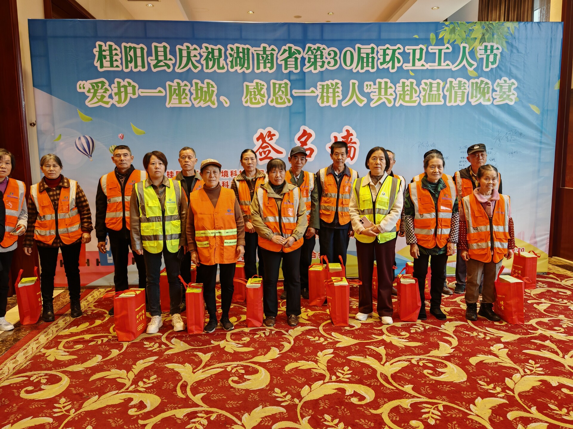 10月26日,我县开展庆祝湖南省第30届环卫工人节--“爱护一座城、感恩一群人”共赴温情夜宴活动。活动由桂阳山水环境科技有限公司主办、郴州萧湘环境科技有限公司、郴州市侨商联合会桂阳办事处承办。